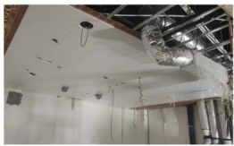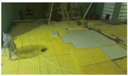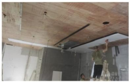 3.顶部地暖铺设: ①安装龙骨、上板(轻钢龙 骨、九厘板);②封底板后装模块走管(包括辐射模 块、地暖管与铺设地面流程相通);③上石膏板、腻 子粉。